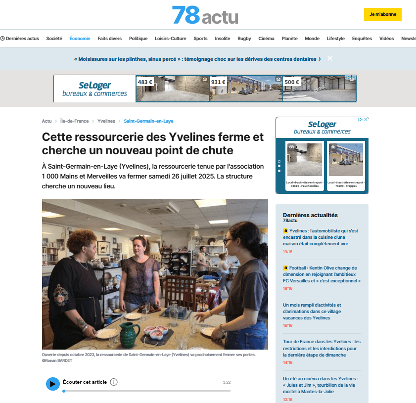Actualités : le bail de la ressourcerie de Saint Germain En Laye s’est terminé le 30 Octobre 2025. Nous avons aménagé un nouveau local de collecte et tri à Chavenay. Notre boutique de Plaisir vous accueille du lundi au samedi de 10h à 19h au sein du centre Aushopping, en face de Cache Cache.